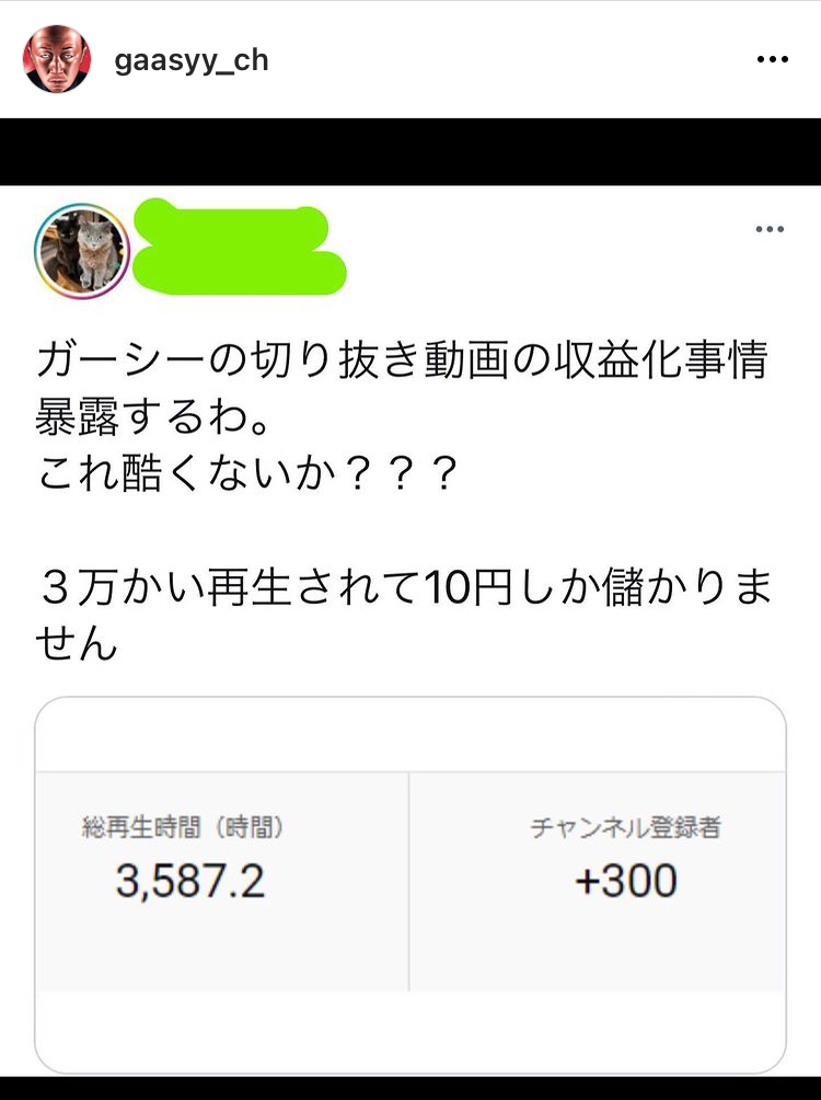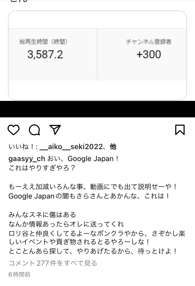 ガーシーさん、切り抜きが3万再生もされたのに収益10円しかなくGoogleにブチ切れ Twitter Facebook はてブ LINE コピー 2022.08.20 スポンサーリンク 1: それでも動く名無し 2022/08/20(土) 21:19:03.02 ID:8jht7g2Y0 https://www.instagram.com/p/CheJ40MJt_B/ 2: それでも動く名無し 2022/08/20(土) 21:19:25.33 ID:8jht7g2Y0 これ完全に闇やろ 5: それでも動く名無し 2022/08/20(土) 21:20:33.16 ID:8Jh5222P0 他力本願してて草 続きを読む
