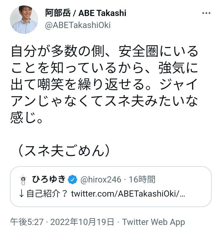 沖縄タイムス阿部岳記者「ひろゆきはスネ夫。自分が安全圏にいるから強気に出て嘲笑を繰り返せる」 Twitter Facebook はてブ LINE コピー 2022.10.19 スポンサーリンク 1:2022/10/19(水) 19:23:07.03 ID:hRean1c+0ひろゆき氏がツイートした辺野古前の掲示板が新品に これまで同様「不屈 座り込み抗議」https://www.okinawatimes.co.jp/articles/-/1043250転載元スレッド:https://hayabusa9.5ch.net/test/read.cgi/news/1666174987/ 続きを読む