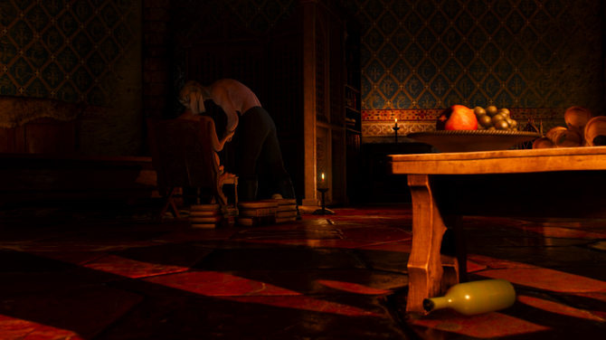 『ウィッチャー3』冒頭の場面です。キャンドルの明かりで照らされてはいるものの、テーブルの下など影になっている部分は全然見えません。調整がデフォルトの状態だと「よく見えない」ことがよくあったのではないでしょうか。