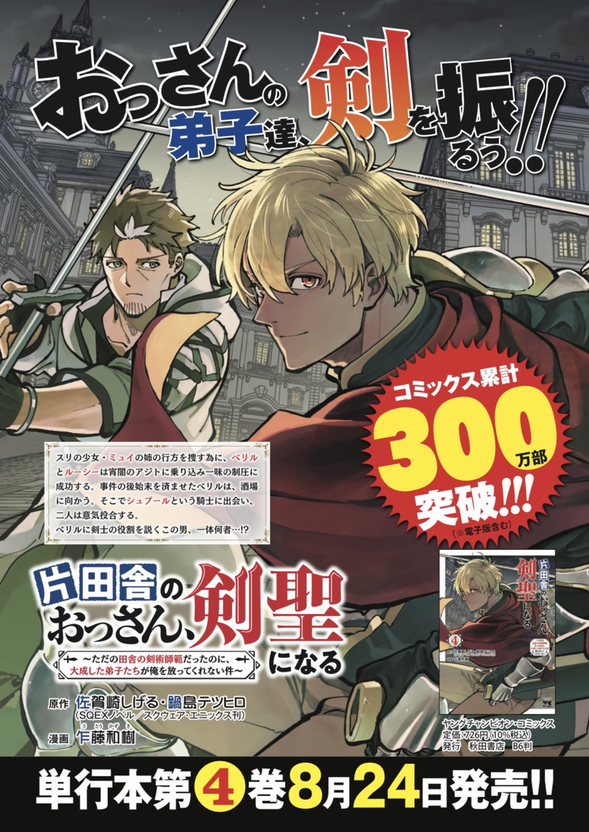 小説投稿サイト「小説家になろう」から生まれた未来人Aさんのライトノベルのコミカライズ「片田舎のおっさん、剣聖になる~ただの田舎の剣術師範だったのに、大成した弟子たちが俺を放ってくれない件~」(秋田書店)のコミックス最新4巻が、8月24日発売に発売された。コミックスの累計発行部数が300万部を突破するなど人気を集めている。