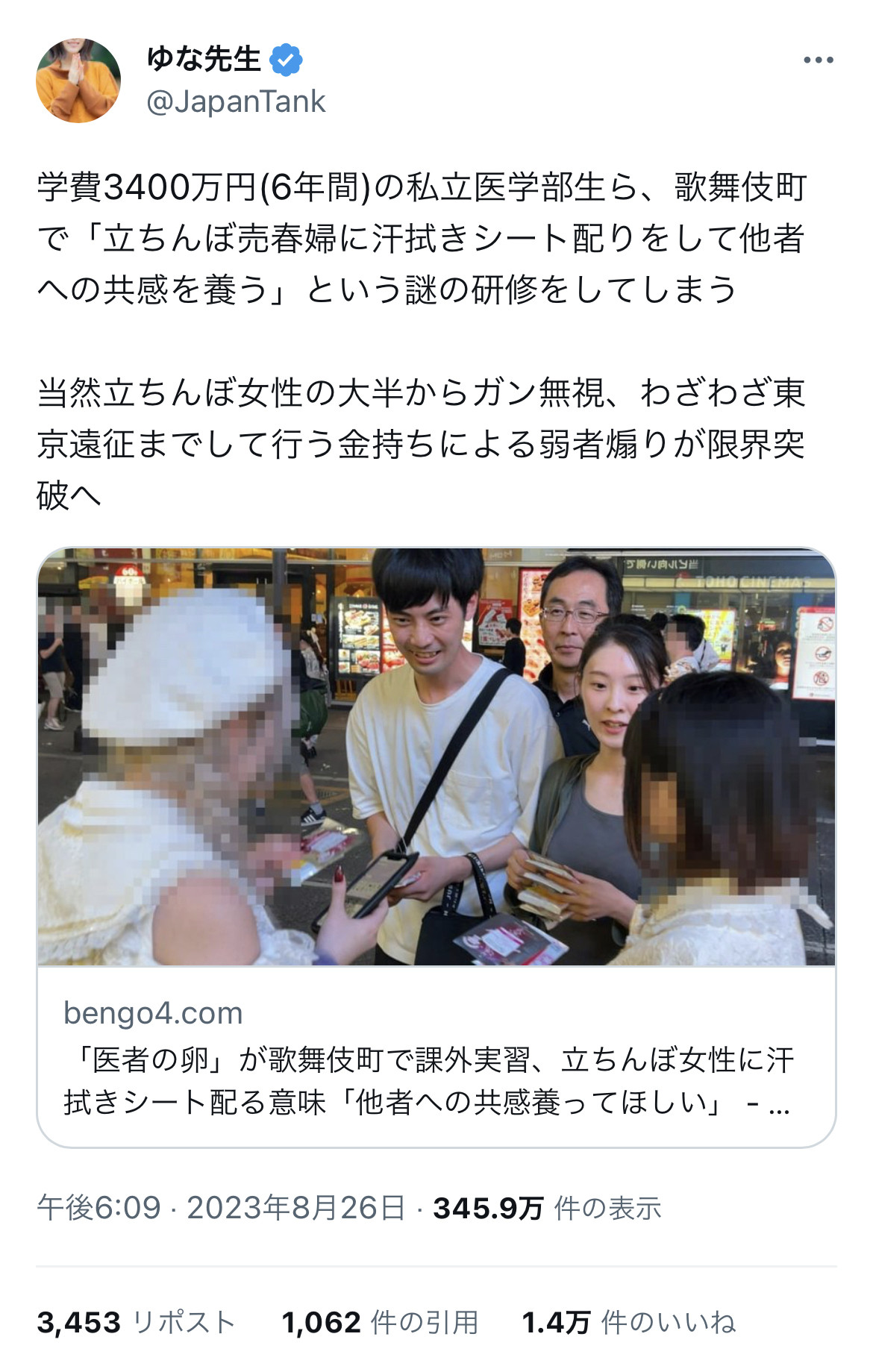 「医者の卵」が歌舞伎町で課外実習、立ちんぼ女性に汗拭きシート配る意味「他者への共感養ってほしい」