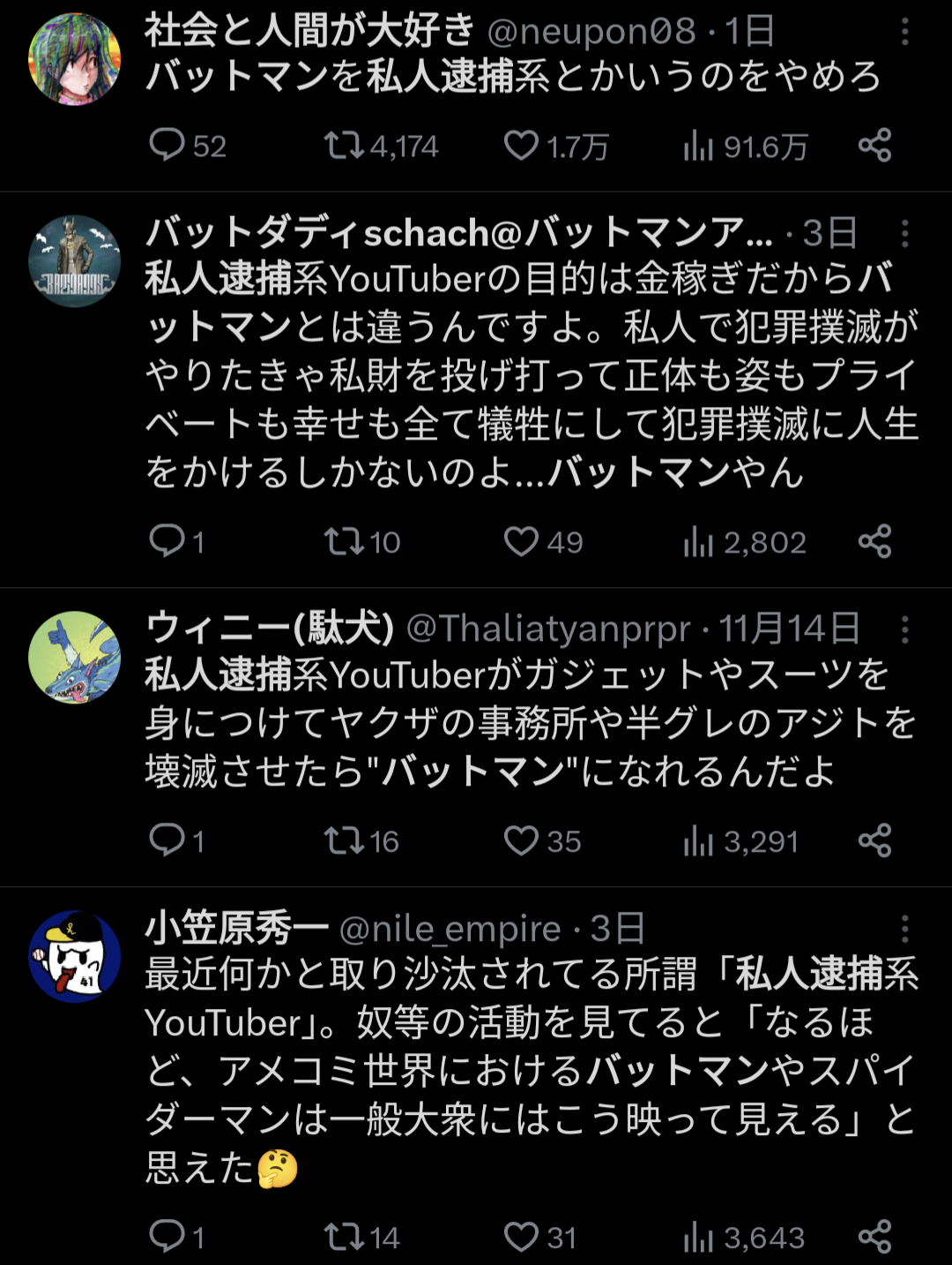 【悲報】バットマンさん、私人逮捕系と言われ始めるww Twitter Facebook はてブ LINE コピー 2023.11.23 スポンサーリンク 1: それでも動く名無し 2023/11/22(水) 14:12:14.95 ID:H03zqScY0 どうして… 2: それでも動く名無し 2023/11/22(水) 14:14:54.70 ID:MvyayVT0M バットマンは確信犯よ 4: それでも動く名無し 2023/11/22(水) 14:15:58.15 ID:poz1Qos50 バットマンって自分がヴィランと変わらないの理解してやってるやろ? 続きを読む