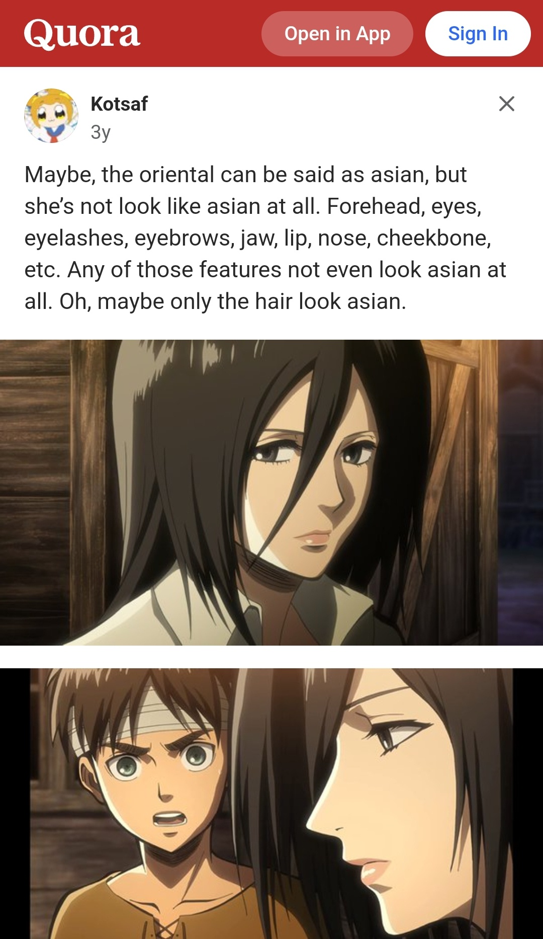 【悲報】白人「進撃のミカサはアジア人じゃなくて白人。美人で目がでかくて顔の形整ってるからアジア人の特徴まったくない。黒髪なだけ」 (※画像あり) Twitter Facebook はてブ LINE コピー 2024.08.24 スポンサーリンク 1:以下、?ちゃんねるからVIPがお送りします:2024/08/23(金) 22:50:28.022 ID:YjKQyUTM0 どうして… 2:以下、?ちゃんねるからVIPがお送りします:2024/08/23(金) 22:50:40.977 ID:YjKQyUTM0 3:以下、?ちゃんねるからVIPがお送りします:2024/08/23(金) 22:51:36.723 ID:U7B54vnk0 漫画になにゆってんの 続きを読む
