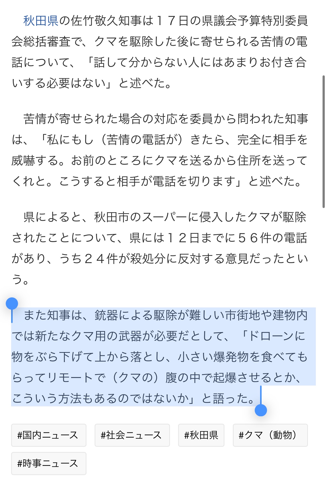 【悲報】秋田県知事「食べ物に爆弾仕掛けて、クマが食べたら腹の中で爆発させればいい」 Twitter Facebook はてブ LINE コピー 2024.12.18 スポンサーリンク 1:以下、?ちゃんねるからVIPがお送りします:2024/12/18(水) 12:23:15.926 ID:zM3/5ibZ0 流石にやりすぎやろ… 3:以下、?ちゃんねるからVIPがお送りします:2024/12/18(水) 12:24:29.500 ID:SrWQGVCsM 熊にどんだけ恨みあるんだよ 5:以下、?ちゃんねるからVIPがお送りします:2024/12/18(水) 12:25:01.335 ID:1lUduRVi0 愛誤煽っててわろ 続きを読む