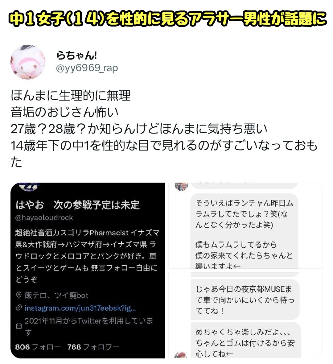 【画像】中1女子「性的な目で見てくる27歳のオッサン、ほんまに気持ち悪い…」 Twitter Facebook はてブ LINE コピー 2025.01.26 スポンサーリンク 1:それでも動く名無し:2025/01/25(土) 03:23:46.21 ID:wj58qkE70.net 2:それでも動く名無し:2025/01/25(土) 03:25:56.93 ID:em4yjmXB0.net 中1にこれは普通にアウトや 113:それでも動く名無し:2025/01/25(土) 05:03:51.61 ID:yFyC0Hy90.net >>2 こんなん中1じゃなくてもアウトだわガイジ 続きを読む