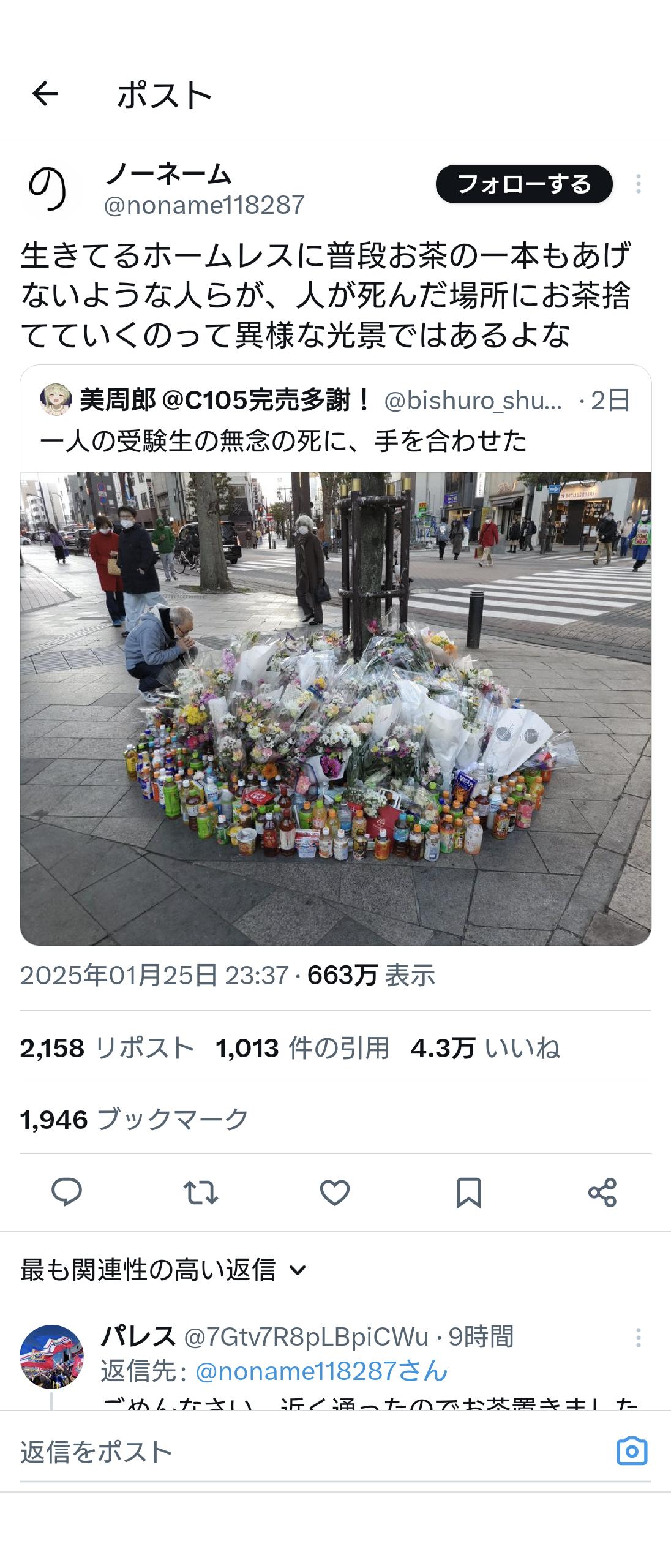 【画像】飲酒運転の車に受験生が轢かれた事故の現場、さすがにお供えの花が異常wwwwww Twitter Facebook はてブ LINE コピー 2025.01.28 スポンサーリンク 1:それでも動く名無し:2025/01/27(月) 22:57:18.43 ID:SHJ7348p0.net なんやこれ 2:それでも動く名無し:2025/01/27(月) 22:59:19.11 ID:XrQYeznS0.net ホームレスは自業自得やからやろバカタレ 続きを読む