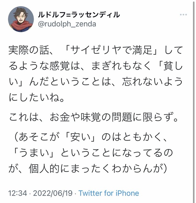サイゼリヤで満足する事が「貧しい」のではなく、本当の「貧しい」とは、なかなか満足せずにもっともっと欲しがり続けることです。