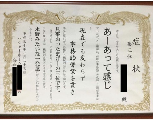 ある住宅会社の課長が新年会で賞状ではなく症状を社員に渡す