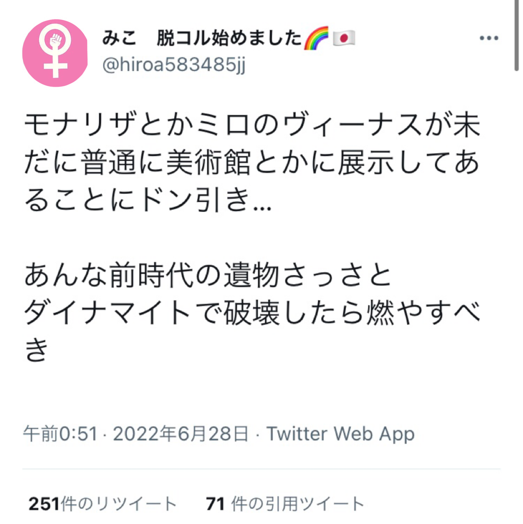 フェミニスト「モナリザとかミロのヴィーナスは女性差別の象徴!燃やして破壊すべき!」 Twitter Facebook はてブ LINE コピー 2022.06.30 スポンサーリンク 1:風吹けば名無し:2022/06/29(水) 14:55:05.26 ID:q8v3czDppNIKU 3:風吹けば名無し:2022/06/29(水) 14:55:33.68 ID:wpnagBy6pNIKU もうフェミニストって完全に病気やな 4:風吹けば名無し:2022/06/29(水) 14:55:50.25 ID:cJAzCoMHpNIKU フェミってテロリストと同じやん 続きを読む