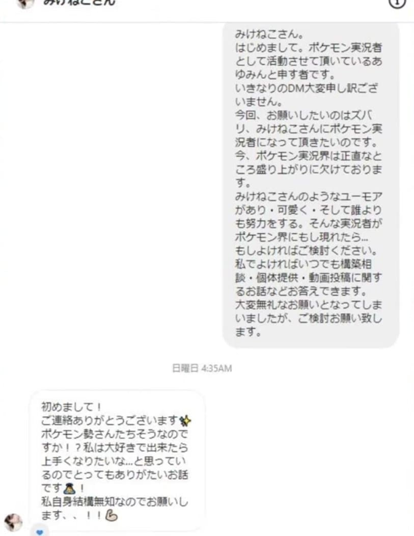 ポケモン実況者のあゆみんがみけねこに「これからポケモン実況者にならない?」とDMを送る