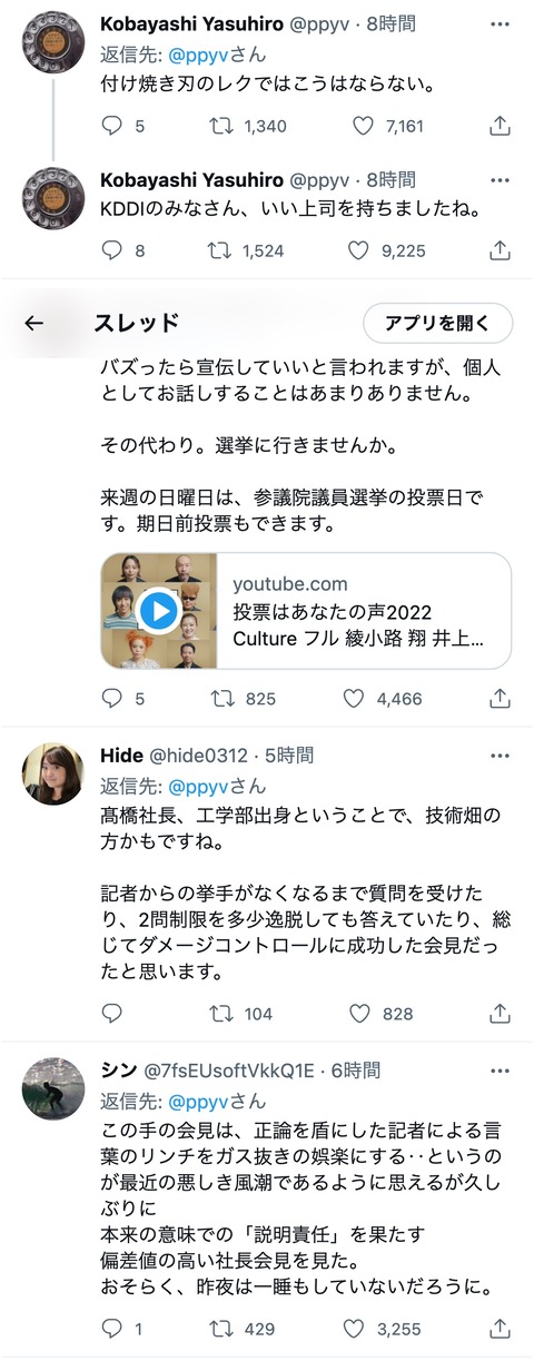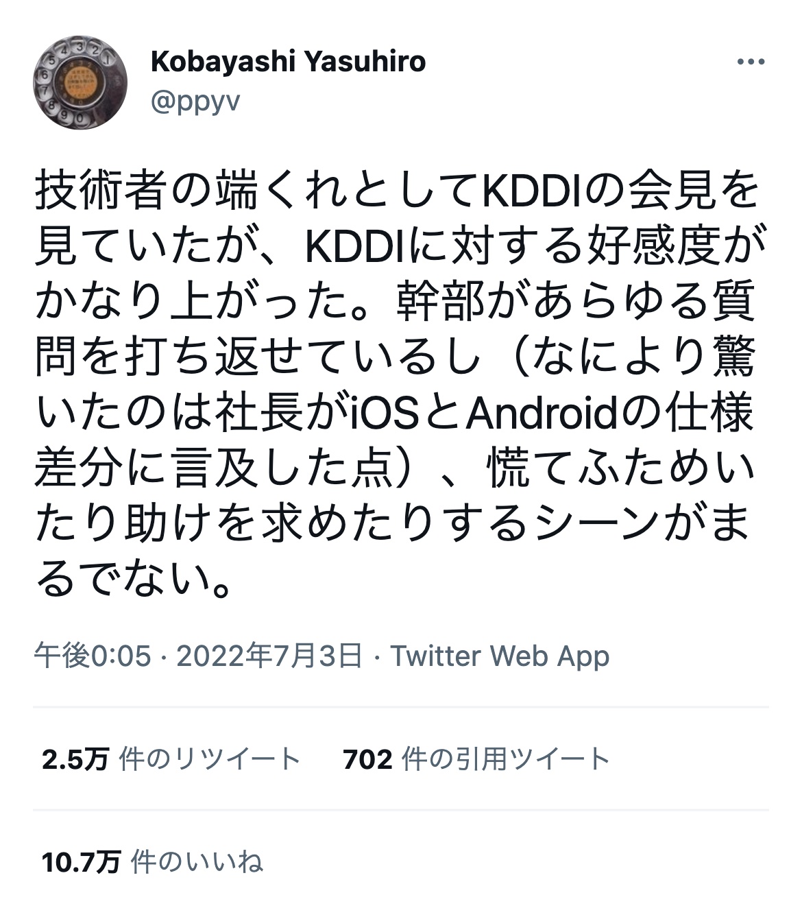 一流技術者「auの会見で幹部があらゆる質問を論破して好感度がかなり上がった」→10万いいね Twitter Facebook はてブ LINE コピー 2022.07.04 スポンサーリンク 1:風吹けば名無し:2022/07/03(日) 21:13:38 3:風吹けば名無し:2022/07/03(日) 21:14:28 くせえくせえ 4:風吹けば名無し:2022/07/03(日) 21:15:11 ワイは週末に駆り出されて直るまで働かれる下っ端に感情移入してまう 52:風吹けば名無し:2022/07/03(日) 21:34:30 >>4 代休とるしそこはええやろ 続きを読む