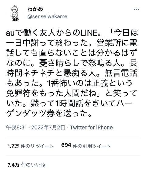 auの店員「正義という免罪符を持った人間が一番怖い」 Twitter Facebook はてブ LINE コピー 2022.07.04 スポンサーリンク 1:風吹けば名無し:2022/07/03(日) 22:10:04.19 ID:DqPM3Jaja.net 2:風吹けば名無し:2022/07/03(日) 22:10:43.14 ID:WRyNUlev0.net ソフトバンクは繋がってたからな 3:風吹けば名無し:2022/07/03(日) 22:10:50.64 ID:ZxBv6/aTa.net 月額1万近く払ってんのに文句言っちゃダメなんか ポボとの差別点そこなのにw 続きを読む