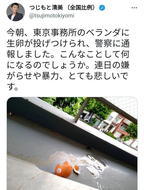 今朝、東京事務所のベランダに生卵が投げつけられ、警察に通報しました。こんなことして何になるのでしょうか。連日の嫌がらせや暴力、とても悲しいです。