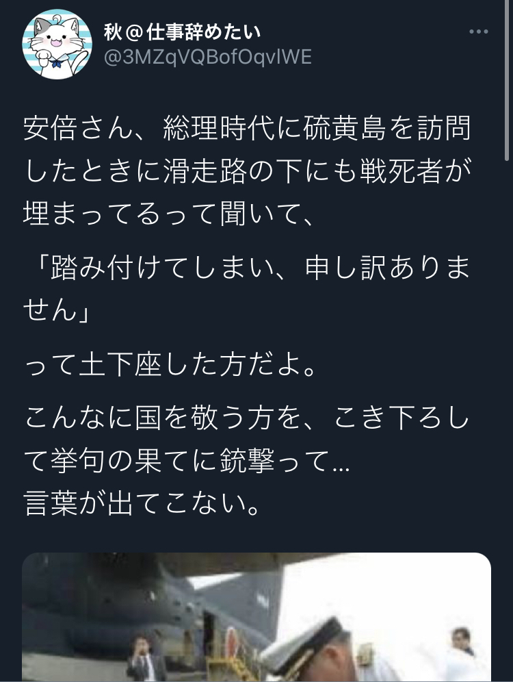安倍ちゃんが硫黄島訪問時にとった行動がすごいと話題に Twitter Facebook はてブ LINE コピー 2022.07.10 スポンサーリンク 1 : 風吹けば名無し :2022/07/09(土) 22:32:37.93 ID:hsv6YJaV0安倍さん、総理時代に硫黄島を訪問したときに滑走路の下にも戦死者が埋まってるって聞いて、「踏み付けてしまい、申し訳ありません」って土下座した方だよ。こんなに国を敬う方を、こき下ろして挙句の果てに銃撃って…言葉が出てこない。安倍ちゃん………転載元スレッド:https://eagle.5ch.net/test/read.cgi/livejupiter/1657373557/ 続きを読む