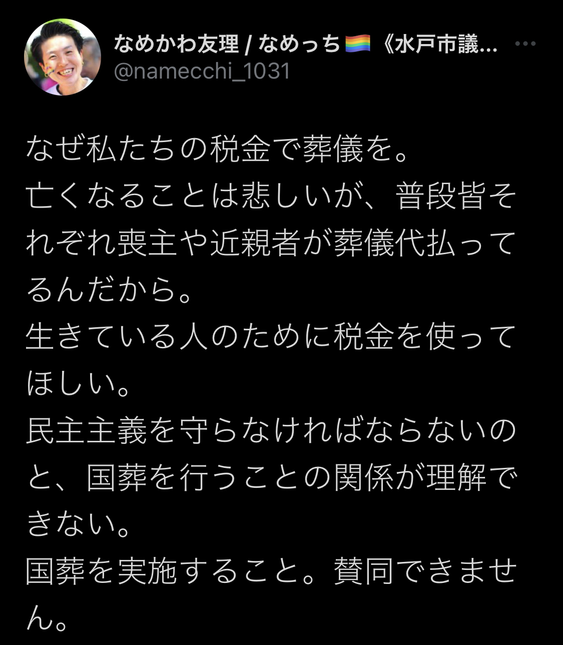 国葬を実施すること。賛同できません。https://t.co/XQkp77AFGc