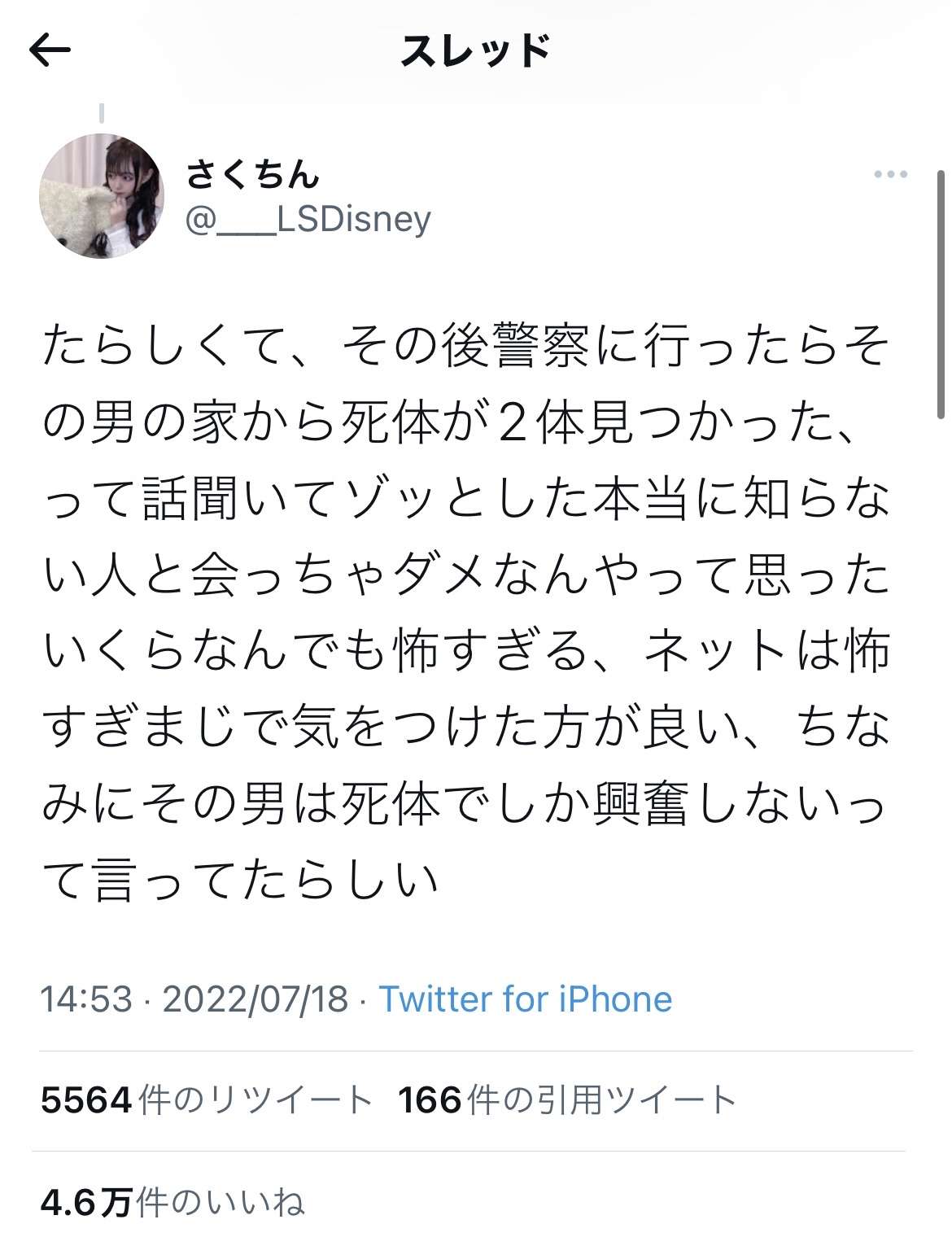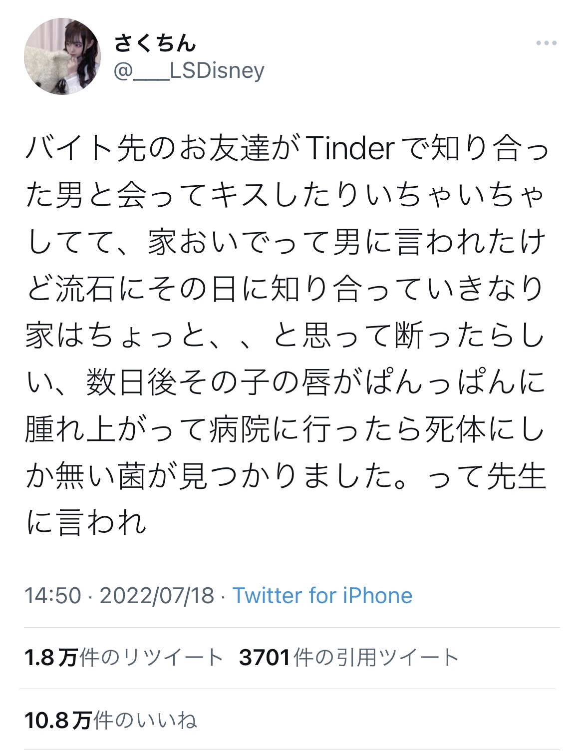 【画像】マッチングアプリ女子、危うく死にかける Twitter Facebook はてブ LINE コピー 2022.07.20 スポンサーリンク 1:以下、?ちゃんねるからVIPがお送りします:2022/07/19(火) 12:57:18 2:以下、?ちゃんねるからVIPがお送りします:2022/07/19(火) 12:58:50 その友達は実は死体だった 3:以下、?ちゃんねるからVIPがお送りします:2022/07/19(火) 12:58:50 都市伝説系で見た内容だね 続きを読む