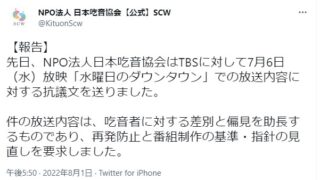NPO法人日本吃音協会は『水曜日のダウンタウン(TBS系)』の7月6日の放送内容に対して抗議文を送ったとTwitterで発表。同協会は「吃音者に対する差別と偏見を助長するものであり、再発防止と番組制作の基準・指針の見直しを要求しました」としている。