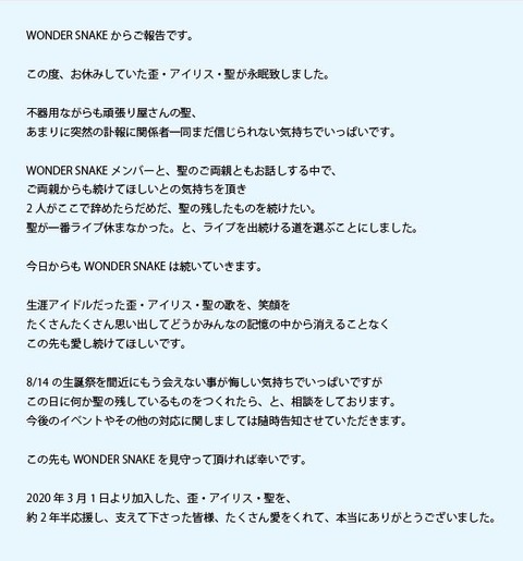 名古屋アイドルグループWONDER SNAKEの歪・アイリス・聖さん死去 14日の誕生日前