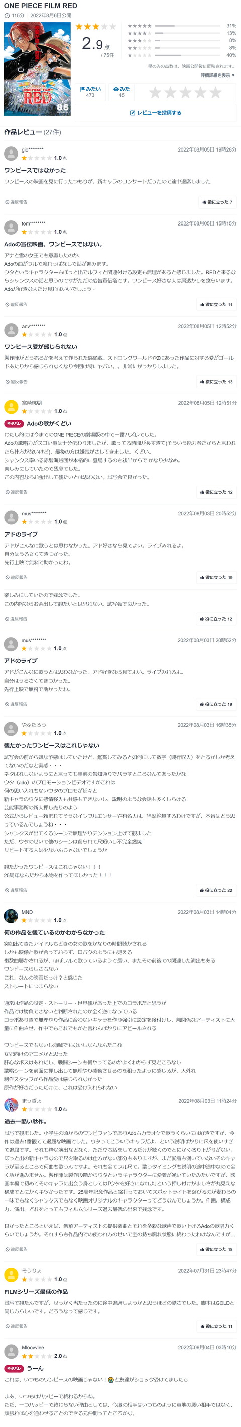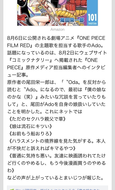 【画像】ワンピースの映画酷すぎると話題にwwwwwwww Twitter Facebook はてブ LINE コピー 2022.08.06 スポンサーリンク 17:以下、?ちゃんねるからVIPがお送りします:2022/08/05(金) 22:46:00 >>1 7:以下、?ちゃんねるからVIPがお送りします:2022/08/05(金) 22:43:27 14:以下、?ちゃんねるからVIPがお送りします:2022/08/05(金) 22:45:07 >>7 一般人がネタでいうのもどうかと思うレベルなのに本人がこんなこと言ってたのか 続きを読む