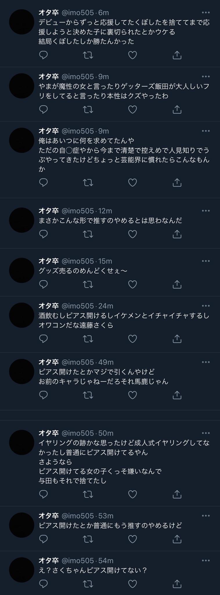 アイドル「ピアス開けました〜」←オタク発狂wwwwwwwwww Twitter Facebook はてブ LINE コピー 2022.01.12 スポンサーリンク 1:風吹けば名無し:2022/01/11(火) 15:35:41.84 ID:d8Pb1ApW0.net 4:風吹けば名無し:2022/01/11(火) 15:37:37.94 ID:0nG+ikNq0.net ピアス開けるなんて純不良やん 5:風吹けば名無し:2022/01/11(火) 15:38:10.88 ID:ziRA7w5vM.net 遠藤さくらちゃんのことやん 可哀想 7:風吹けば名無し:2022/01/11(火) 15:38:39.70 ID:1bQZVWWq0.net ピアスつけてよかったな 続きを読む