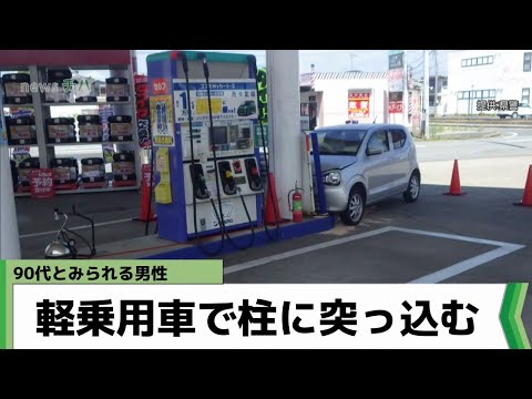 90代と見られる男性運転の軽乗用車 ガソリンスタンドの柱に突っ込む