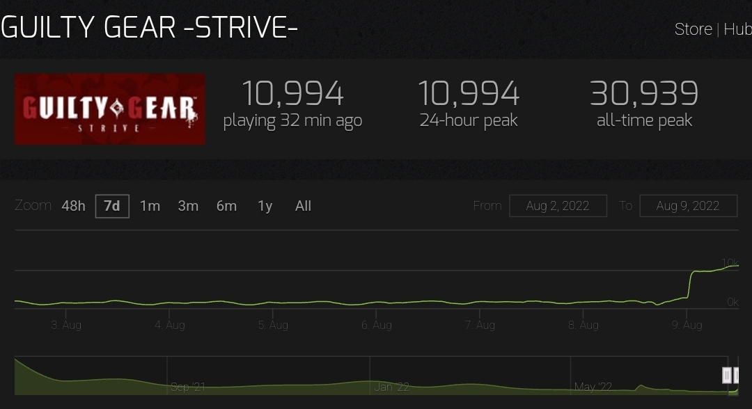 8日に有料DLCキャラクターとしてブリジットが参戦すると発表。8月1日時点では1時間のプレイヤー数の平均値は2000人前後となっていたが、8月8日17時には9586人を記録した。 pic.twitter.com/Rx3FUT8Ueg