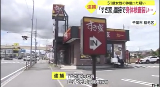 牛丼チェーン店「すき家」のバイト面接で、身体検査を装い、51歳の女性の体を触った疑いで、元社員の男が逮捕された。