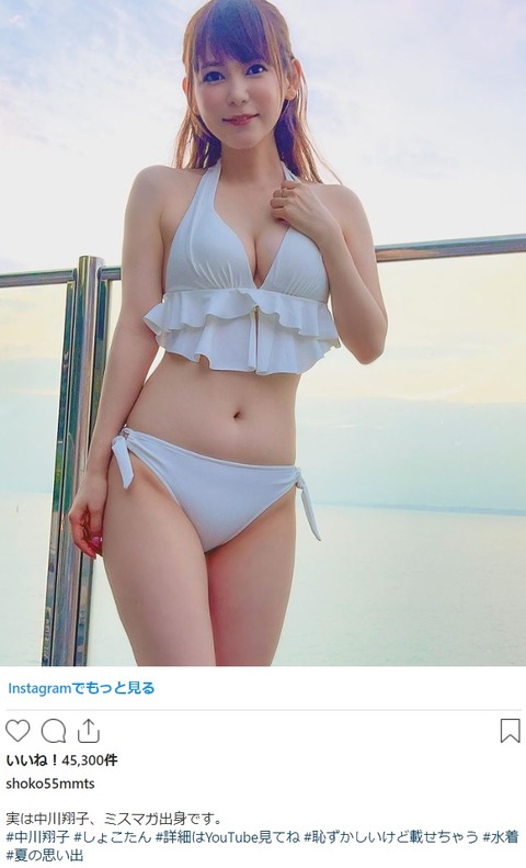 前日の投稿で「YouTube動画で、100億年ぶりに水着を着ました…」と、胸の谷間があらわとなったアップショットを公開。この日の投稿では「実は中川翔子、ミスマガ出身です」と、水着姿の全身ショットをアップ。「#恥ずかしいけど載せちゃう #水着 #夏の思い出」と披露した。