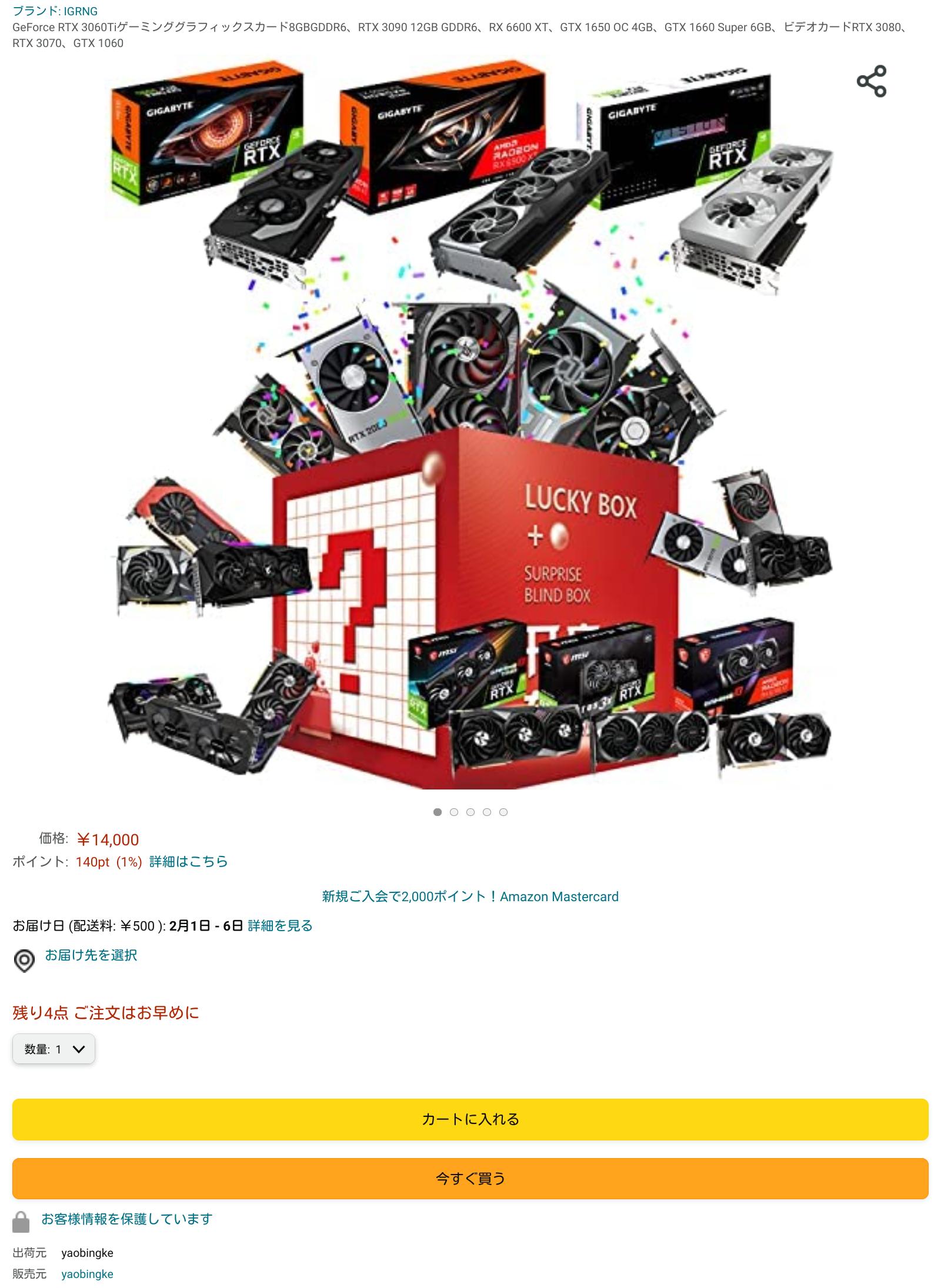 【悲報】Amazonさん、とんでもない商品の販売を許してしまう Twitter Facebook はてブ LINE コピー 2022.01.12 スポンサーリンク 1: 風吹けば名無し 2022/01/12(水) 11:03:49.88 ID:gV3skSTuM GPUガチャ [グッドボックス]:RTX3090、RTX 3080 Ti、RTX 3070 Ti、RTX 3060 Ti、RX 6900 XT、RX 6800、RX 6700 XT、RX 6600 XTを含む、 NVIDIAおよびAMDグラフィックスカードのすべてのシリーズが含まれています。 (グラフィックカードには中古品と新品が含まれています。GeForce30シリーズとRX 6000は新品です。) 6: 風吹けば名無し 2022/01/12(水) 11:04:55.46 ID:3Fo7L6k0a 絶対ゴミしか入ってないわ 8: 風吹けば名無し 2022/01/12(水) 11:05:02.01 ID:ijBcmeMS0 買うバカいないだろ 続きを読む