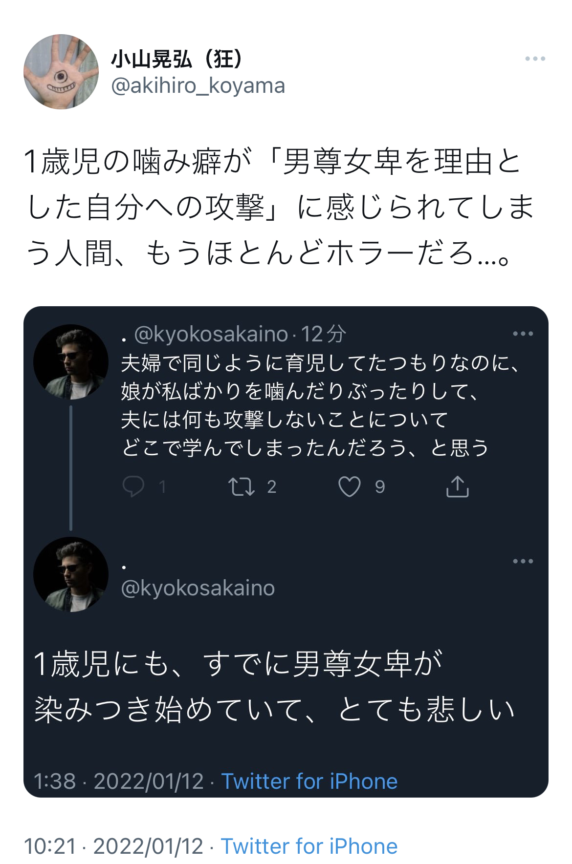 【悲報】フェミニスト、1歳児息子の噛み癖を「男尊女卑を理由とした自分への攻撃」と感じてしまうwwwwwww