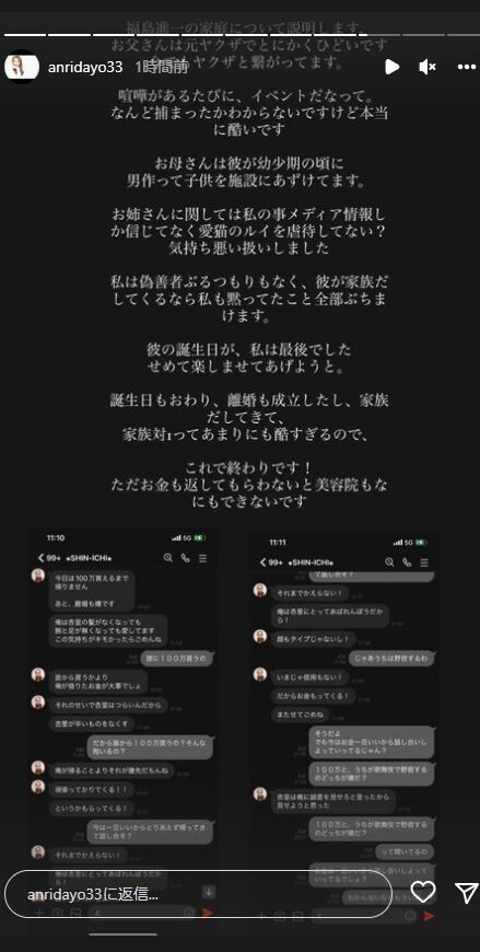 7日には新婚の夫と金銭トラブルがあったと明かし、「YouTubeでは自分の株価上げて、優しい旦那演じてますけどこれが本当の本性です。離婚したい。出ていきたい」などと心情を明かしていた。