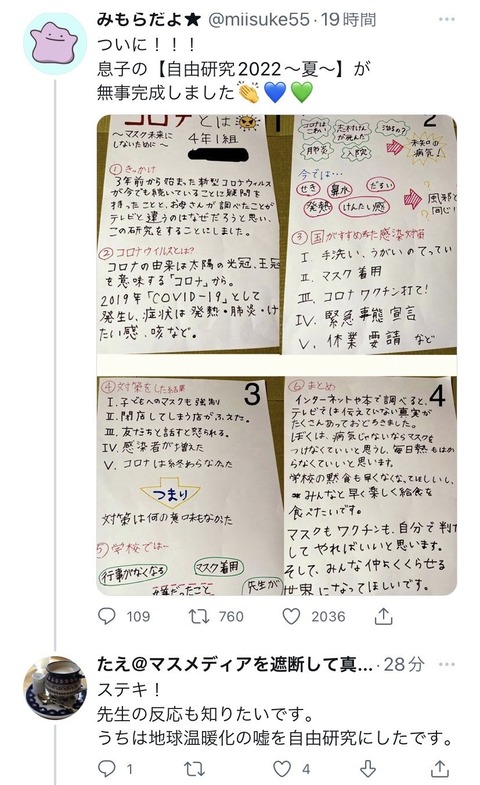【画像】小学生の母親「ウチの息子が自由研究で選んだテーマは『コロナの嘘』。素敵✨」←賛否両論WWWWWWWWWWWWWWWWWWWWWWWWWWWW Twitter Facebook はてブ LINE コピー 2022.08.15 スポンサーリンク 1:くーるびゅー:2022/08/15(月) 14:26:39.965 ID:WgBgKpCg0 2:くーるびゅー:2022/08/15(月) 14:27:08.332 ID:WgBgKpCg0 これ子供が全部考えたのかな 3:以下、5ちゃんねるからVIPがお送りします:2022/08/15(月) 14:27:46.781 ID:wzduRSSg0 このツイートの嘘について研究していいか? 続きを読む