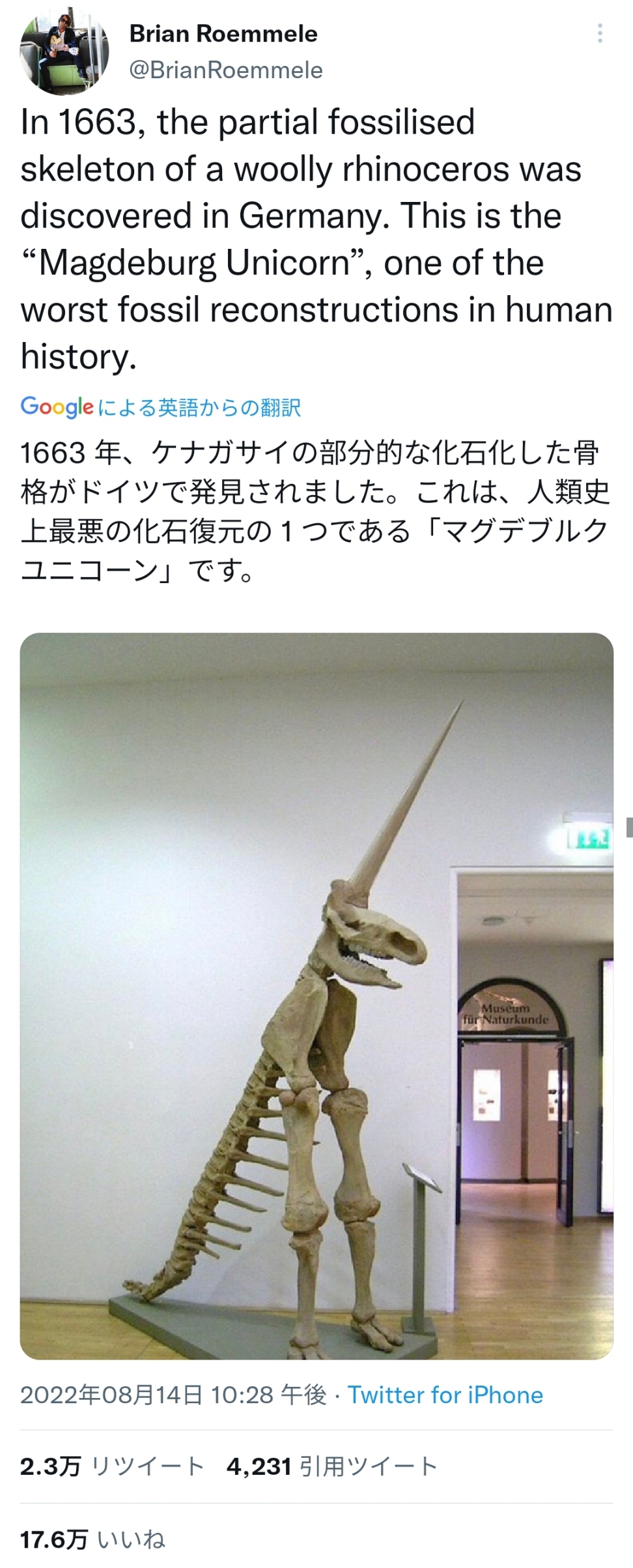 In 1663, the partial fossilised skeleton of a woolly rhinoceros was discovered in Germany. This is the “Magdeburg Unicorn”, one of the worst fossil reconstructions in human history. pic.twitter.com/rmV1vcB3LY