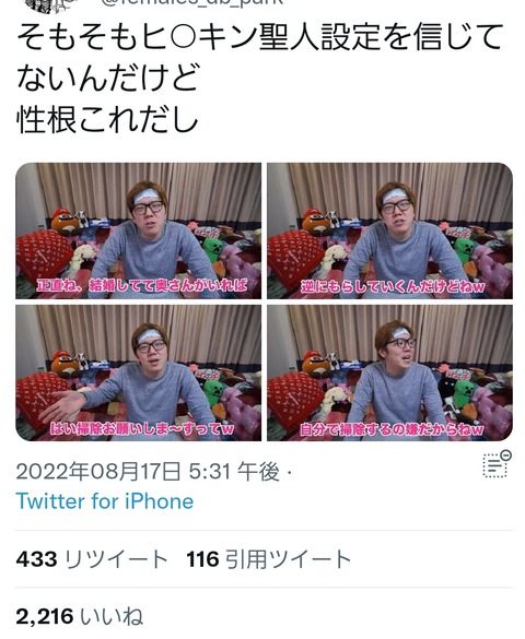 【画像】ヒカキン聖人神話、完全に崩壊してしまう…ただのクソ野郎だとバレ始める😎 Twitter Facebook はてブ LINE コピー 2022.08.19 スポンサーリンク 1:風吹けば名無し:2022/08/19(金) 19:07:42.64 ID:ukvFdpBG0.net 6:風吹けば名無し:2022/08/19(金) 19:08:37.40 ID:21jjurMf0.net 上手く隠してただけでもともと鬼畜やろこいつは 7:風吹けば名無し:2022/08/19(金) 19:08:44.08 ID:K4Gllpye0.net ほどよくクズなのがいいんだろう 続きを読む