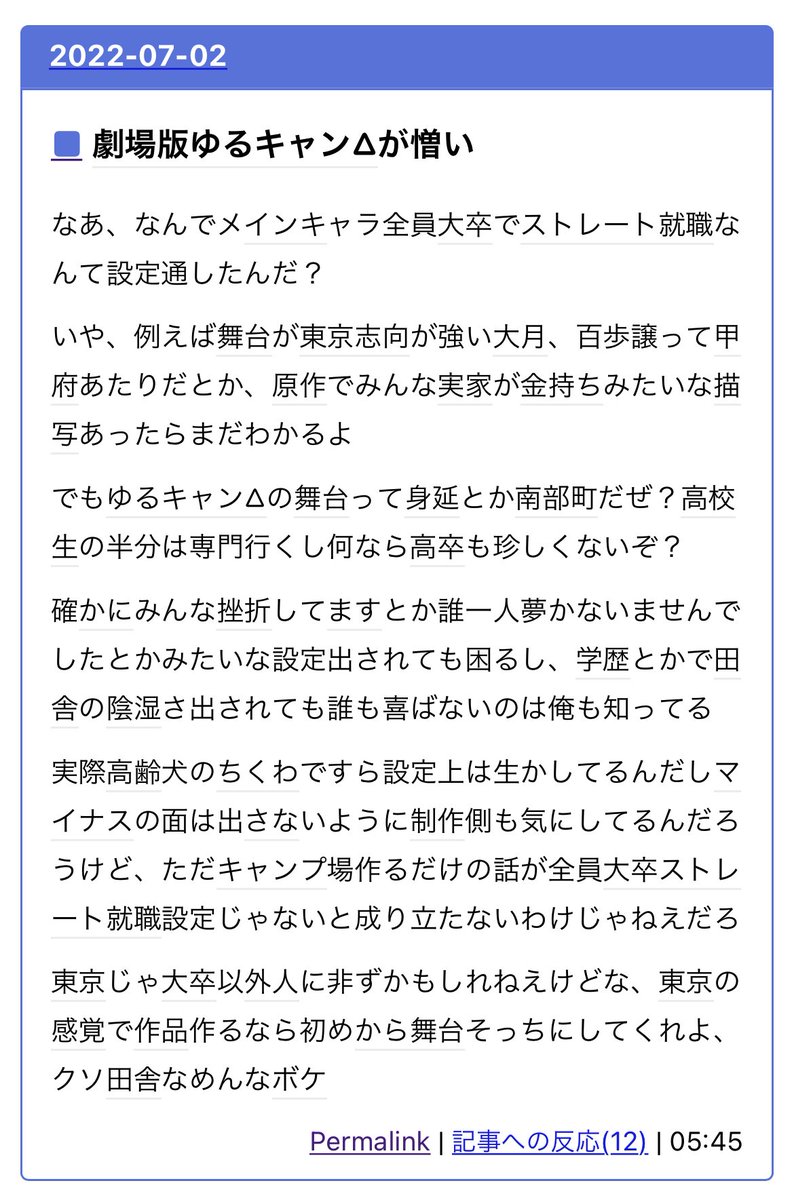 【悲報】劇場版ゆるキャン、非現実的な大卒設定によりガチの田舎者に憎まれまくる