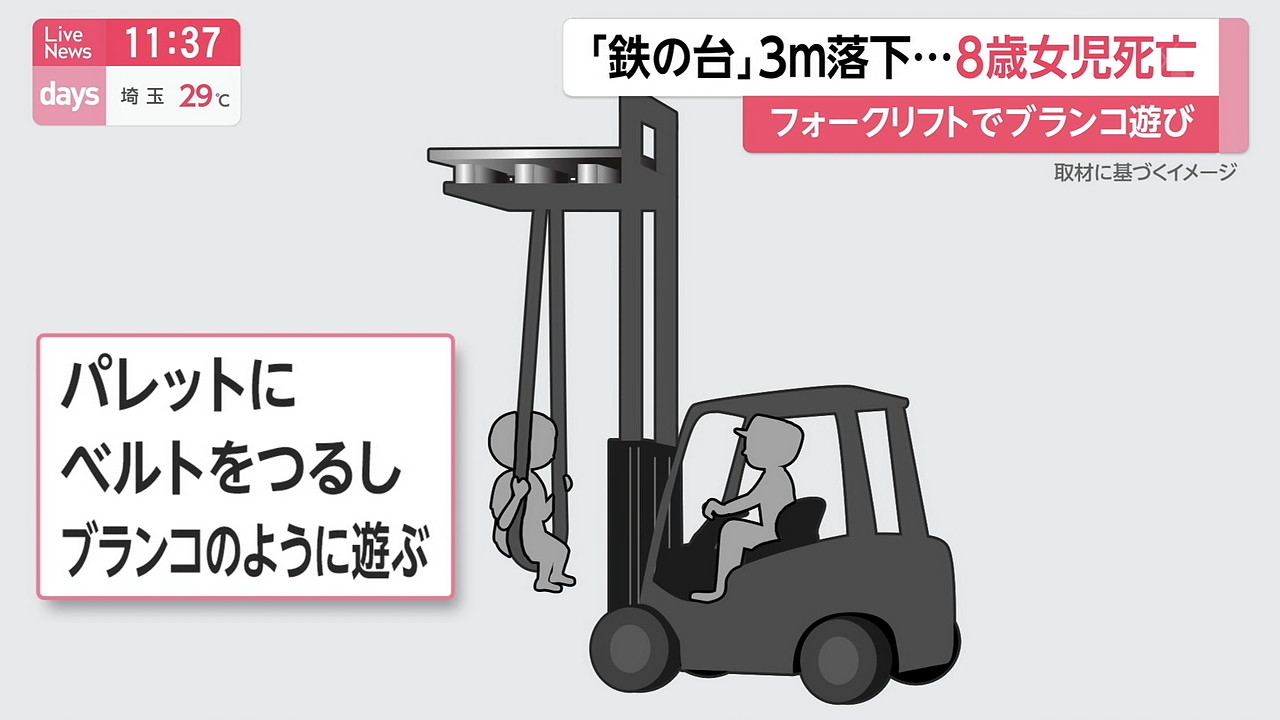 きのう、群馬県前橋市で8歳の女の子が父親と一緒にフォークリフトを使ってブランコのようにして遊んでいたところ、フォークリフトに差し込んでいたパレットが落ち、女の子が死亡しました。