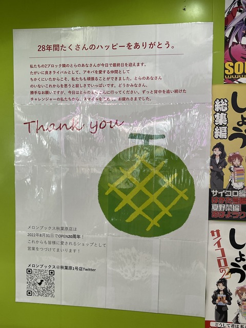 【画像】閉店するとらのあな秋葉原店にメロンブックス秋葉原店が送ったメッセージがこちらwwww Twitter Facebook はてブ LINE コピー 2022.09.01 スポンサーリンク 1:以下、5ちゃんねるからVIPがお送りします:2022/08/31(水) 21:43:28.355 ID:HPtl6xJ+0 2:以下、5ちゃんねるからVIPがお送りします:2022/08/31(水) 21:44:22.851 ID:KJeiWtrAM ワロタ 3:以下、5ちゃんねるからVIPがお送りします:2022/08/31(水) 21:44:45.845 ID:fe+sYhLZ0 言った負けたでいえばアキバ全体負けだよ 続きを読む