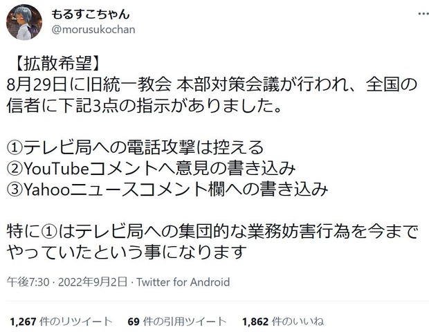 8月29日に旧統一教会 本部対策会議が行われ、全国の信者に下記3点の指示がありました。