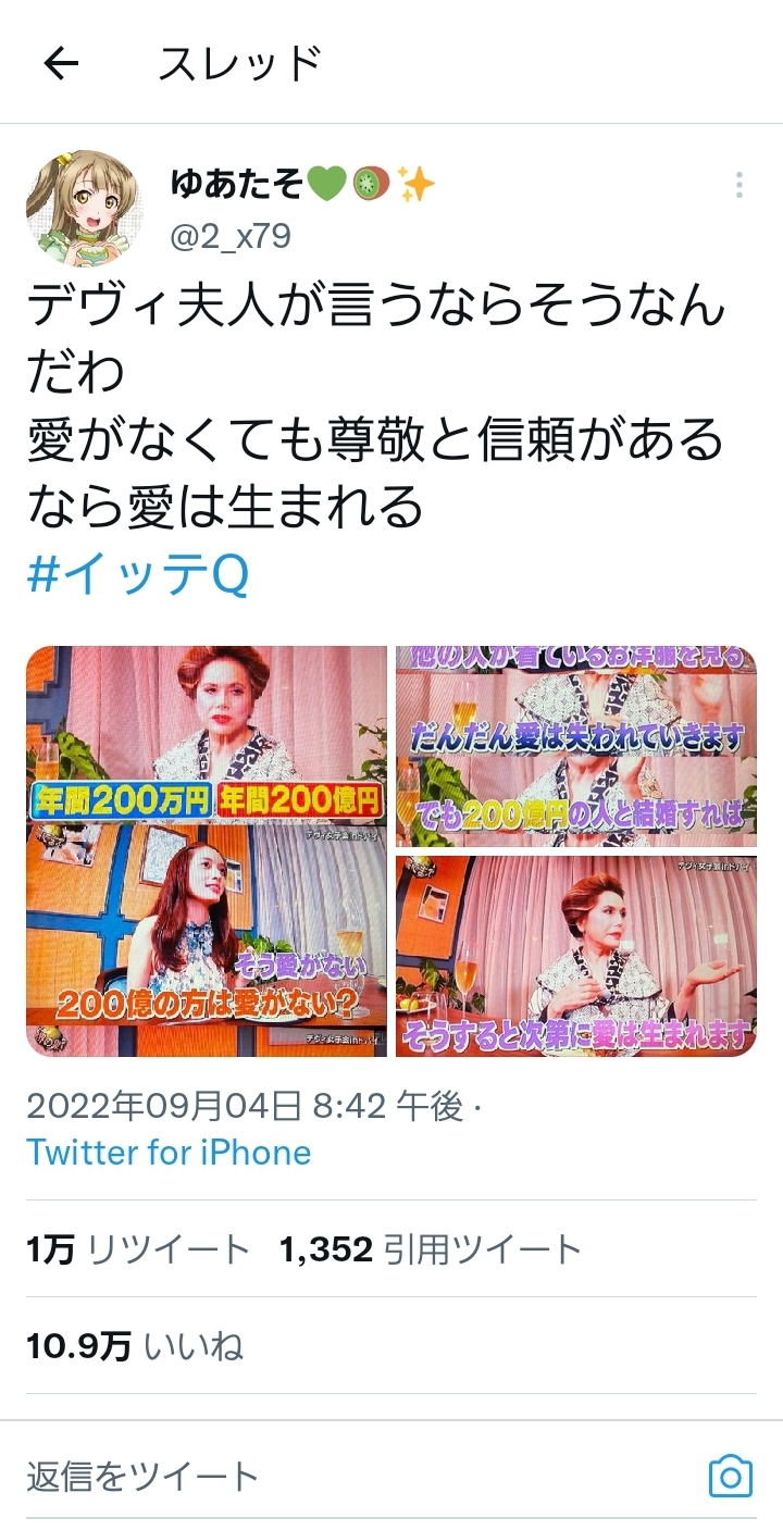 デヴィ夫人「大好きだけど200万の男よりも愛がない200億の男のほうが良い」その理由が深すぎる Twitter Facebook はてブ LINE コピー 2022.09.06 スポンサーリンク 1:風吹けば名無し:2022/09/05(月) 17:22:20.98 ID:Y+2PqAnZ0.net 2:風吹けば名無し:2022/09/05(月) 17:23:01.47 ID:b1L4OdWn0.net キッショ切り抜きやな 動画で貼れや 3:風吹けば名無し:2022/09/05(月) 17:23:32.62 ID:cfX1U7xSd.net 200億稼ぐ人間を好きにならない理由あるか? 4:風吹けば名無し:2022/09/05(月) 17:23:45.89 ID:br/fgsNs0.net 差が極端すぎるやろ 続きを読む