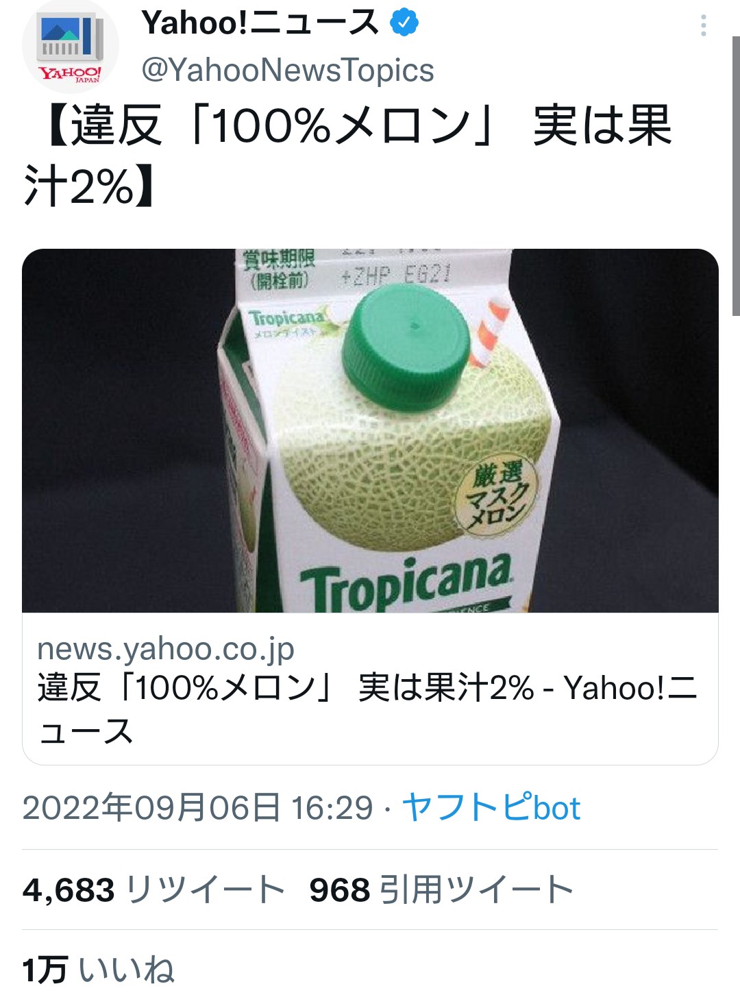 【悲報】98%水のメロンジュースが発売されていた Twitter Facebook はてブ LINE コピー 2022.09.06 スポンサーリンク 1:2022/09/06(火) 19:59:56.83 ID:weOCpfl+rやばトロピカーナ「100%メロンテイスト」 実はメロン2% 景表法違反(毎日新聞) - Yahoo!ニュース転載元スレッド:https://eagle.5ch.net/test/read.cgi/livejupiter/1662461996/ 続きを読む