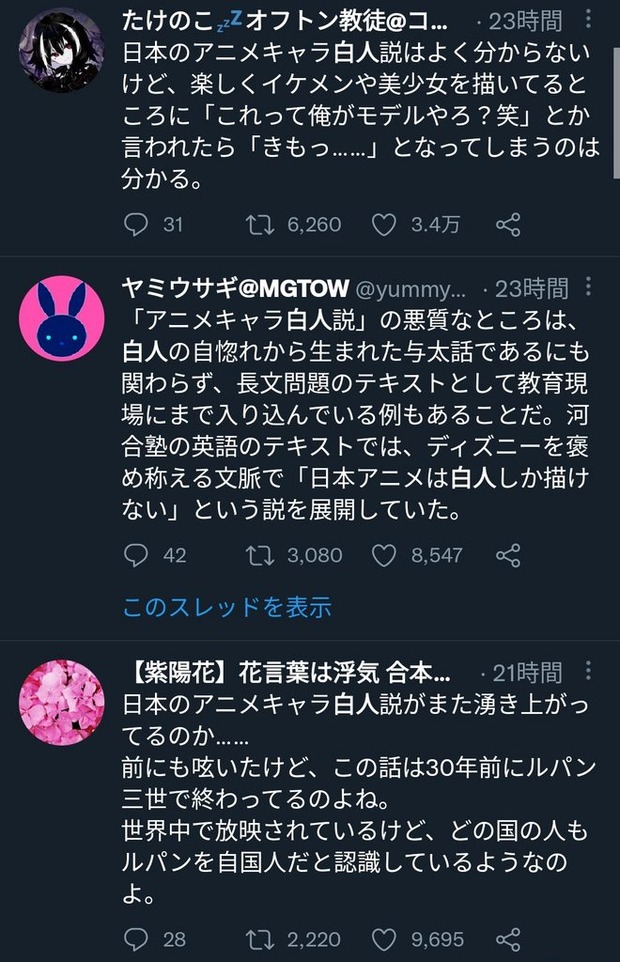 日本人「アニメキャラ白人説」に激怒&反論して論破ww Twitter Facebook はてブ LINE コピー 2022.09.19 スポンサーリンク 1 : 風吹けば名無し :2022/09/19(月) 20:47:28.02 ID:ypNVZ5sU0転載元スレッド:https://eagle.5ch.net/test/read.cgi/livejupiter/1663588048/ 続きを読む