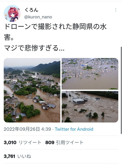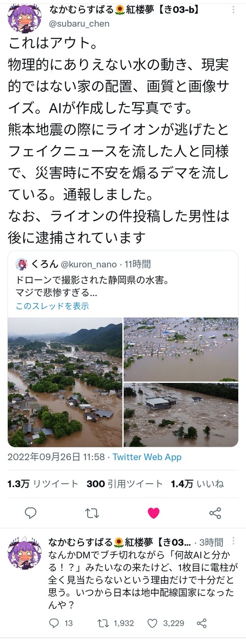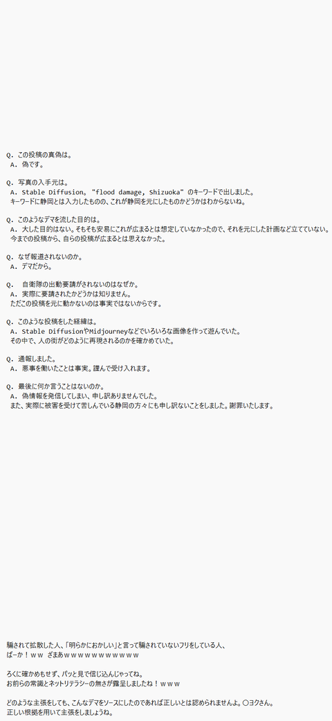 【悲報】画像生成AIで静岡が水没したデマ画像を作ってアップする奴が現れる SNS崩壊へ Twitter Facebook はてブ LINE コピー 2022.09.26 スポンサーリンク 1:風吹けば名無し:2022/09/26(月) 16:20:15.69 ID:XmnYJQIU0.net ↓ ↓ 2:風吹けば名無し:2022/09/26(月) 16:20:41.21 ID:XmnYJQIU0.net バカでも簡単にデマ流して自己顕示欲満たせる時代 続きを読む