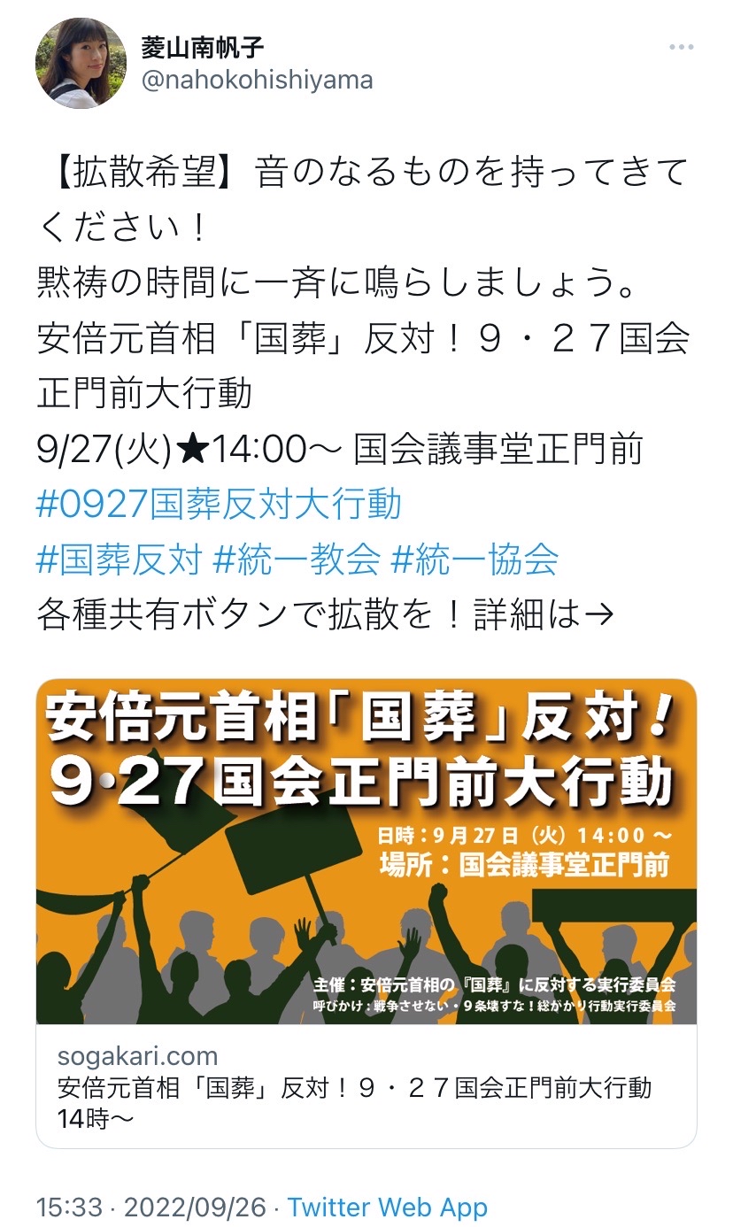 【悲報】国葬反対派「黙祷を邪魔するために音の鳴るものを集めましょう!!!!」 Twitter Facebook はてブ LINE コピー 2022.09.27 スポンサーリンク 1:以下、5ちゃんねるからVIPがお送りします:2022/09/27(火) 10:34:37.919 ID:jHKnVCLc0 お祭り騒ぎで楽しそう 2:以下、5ちゃんねるからVIPがお送りします:2022/09/27(火) 10:35:11.160 ID:G3XLrD8Jr チンドン屋 4:以下、5ちゃんねるからVIPがお送りします:2022/09/27(火) 10:39:59.167 ID:ZDm5RpGE0 これもう自民党員だろ 5:以下、5ちゃんねるからVIPがお送りします:2022/09/27(火) 10:40:04.576 ID:OTt1FpW80 賑やかな送り出しで粋だね それも一種の弔意になるんやで 続きを読む