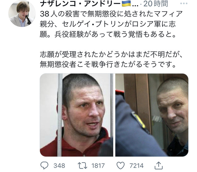 【朗報】38人殺しの無期懲役囚ロシア人、兵役志願‥ Twitter Facebook はてブ LINE コピー 2022.09.29 スポンサーリンク 1: 風吹けば名無し 2022/09/29(木) 18:38:30.77 ID:+X6IwlVX0NIKU 続きを読む