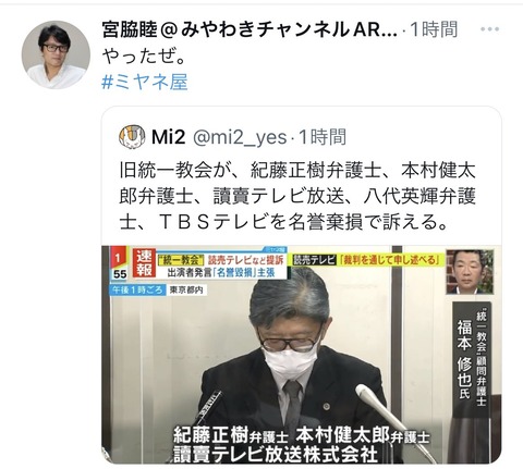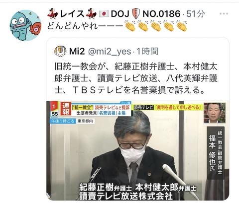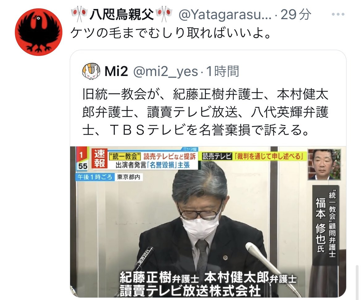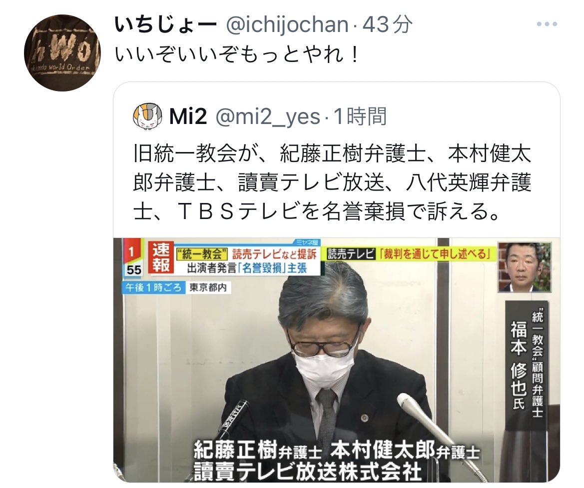 【悲報】統一教会がテレビ局や紀藤弁護士を訴える→ネトウヨさん、統一教会を応援へwwwwww Twitter Facebook はてブ LINE コピー 2022.10.01 スポンサーリンク 2:モモちゃん(ジパング) [KR]:2022/10/01(土) 11:02:30.51 ID:ohap+bS30 BE:127398796-2BP(1000) 7:ラジ男(北海道) [ES]:2022/10/01(土) 11:03:36.45 ID:RWSmZYIg0 いうほどネトウヨか? 12:だっこちゃん(愛媛県) [VN]:2022/10/01(土) 11:04:29.63 ID:OWA/IIQ/0 ネトウヨって反日なの? 続きを読む