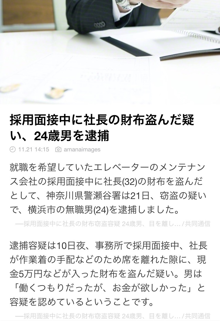 【画像】社長の採用面接で隙を見て社長の財布を盗んだ有能、逮捕されるwwwwwwwwwwwwwwwwwwwww Twitter Facebook はてブ LINE コピー 2022.10.02 スポンサーリンク 1:以下、?ちゃんねるからVIPがお送りします:[ここ壊れてます] .net 社長警戒心NASAすぎだろ… 2:以下、?ちゃんねるからVIPがお送りします:[ここ壊れてます] .net 面接中に抜けるなよ 3:以下、?ちゃんねるからVIPがお送りします:[ここ壊れてます] .net 取り調べ中にも何か盗みそう 続きを読む