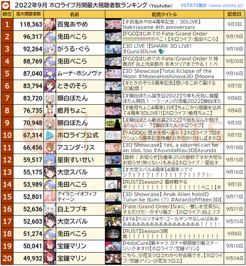 【画像】最新版Vtuber強さランキング、発表されるwwwwwwwwwwwwwwwwwwwwwwwwww Twitter Facebook はてブ LINE コピー 2022.10.02 スポンサーリンク 1:風吹けば名無し:2022/10/02(日) 09:34:41.19 ID:Yij4kgCA0.net 9月の各種データ 最大同接 Top10同接 総視聴時間 2:風吹けば名無し:2022/10/02(日) 09:35:16.98 ID:8RDnoqT00.net ぺこら通常配信で96000は化け物だわ 3:風吹けば名無し:2022/10/02(日) 09:35:30.12 ID:yB1pX4nSa.net ほんまにホロライブ一強なんやな 続きを読む