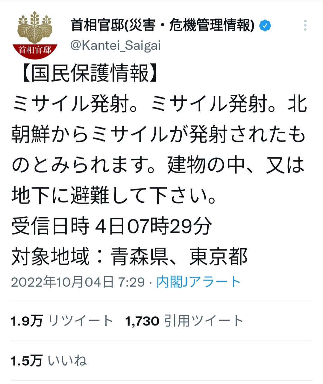 青森真っ赤だったけど、落ちたらどうしようもないんよな。地下に避難して下さいとかニュースでも言ってるけど、青森地下鉄ないからね?防空壕でもあると思ってる?地下シェルターでも税金で作って欲しいもんだわ。