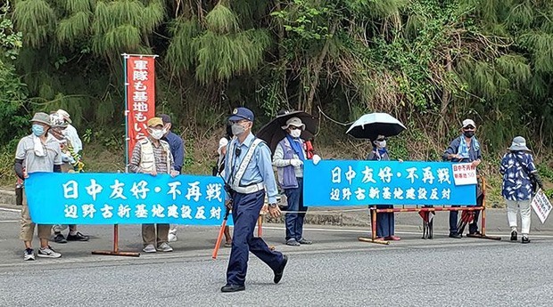【辺野古問題取材班】名護市辺野古の米軍キャンプ・シュワブゲート前で29日、ヘリ基地反対協議会が「日中友好・不再戦」の横断幕を掲げ、新基地建設反対を訴えた。