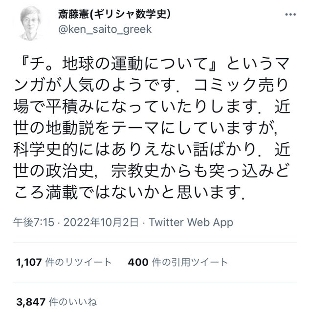 【悲報】学者「『チ。』とかいう漫画が間違いだらけ、これはひどい」→Twitterで大炎上 Twitter Facebook はてブ LINE コピー 2022.10.06 スポンサーリンク 1:2022/10/06(木) 13:13:07.02 ID:dyW82OLY0転載元スレッド:https://hayabusa9.5ch.net/test/read.cgi/news/1665029587/ 続きを読む